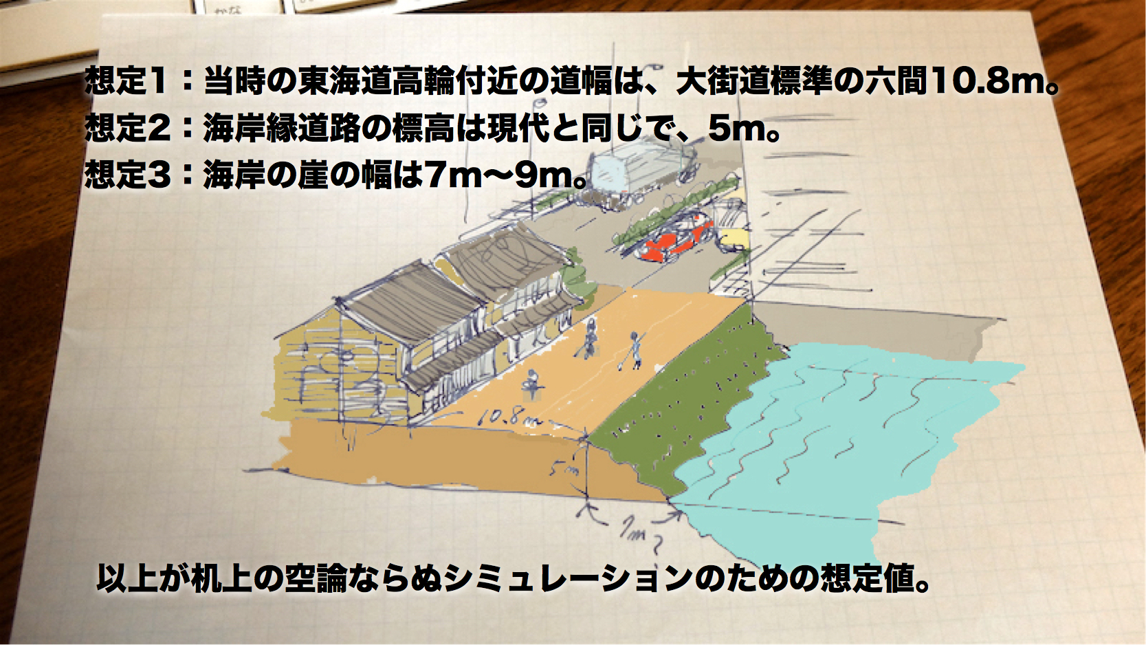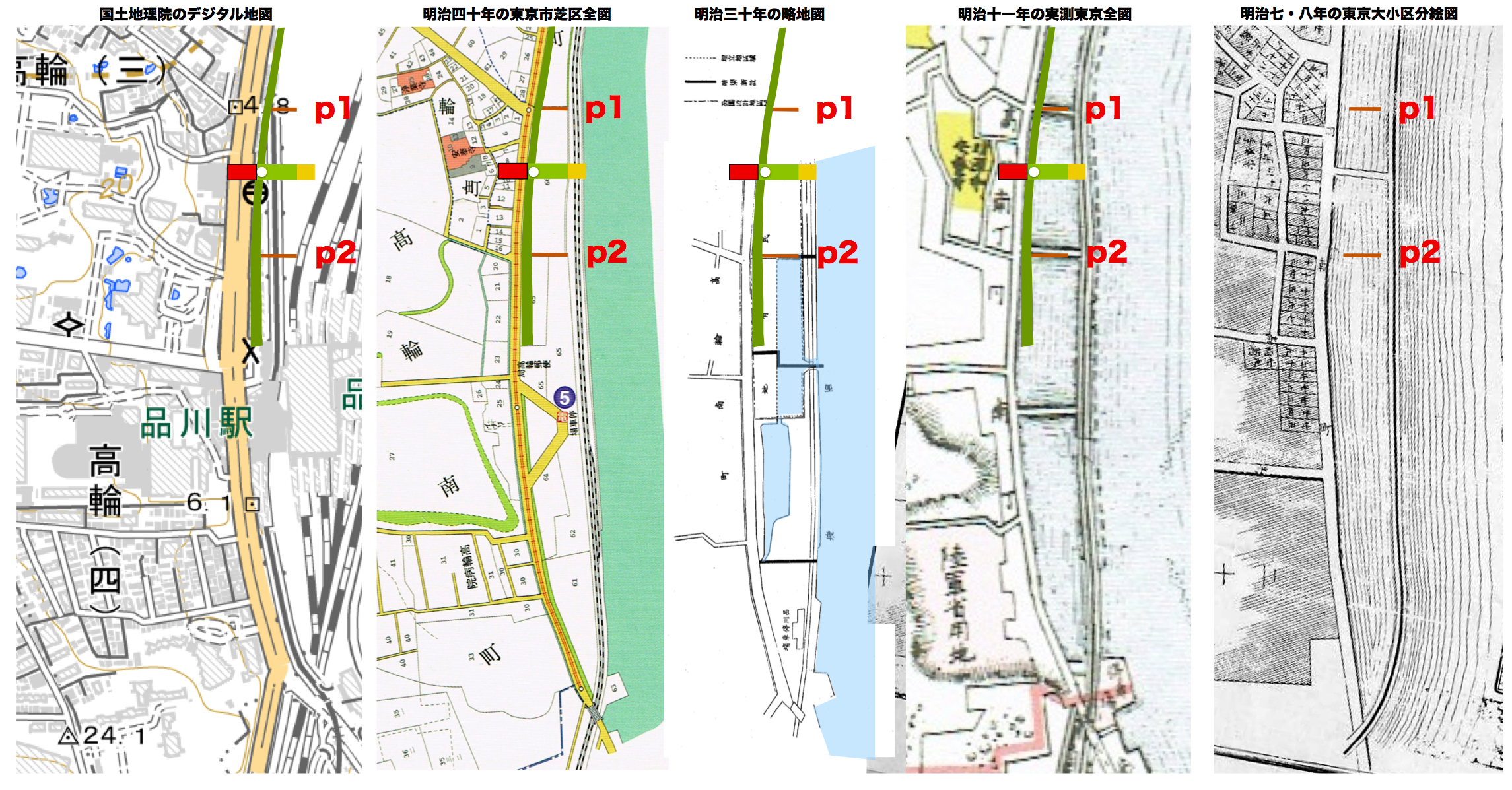 渡り道はいくつもあったが、シミュレーショ検証の場所として先ずは高輪南町の p1 p2ポイントと、さらに品川駅高輪口前交番の3ポイントでシミュレーションをすることとした。