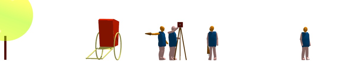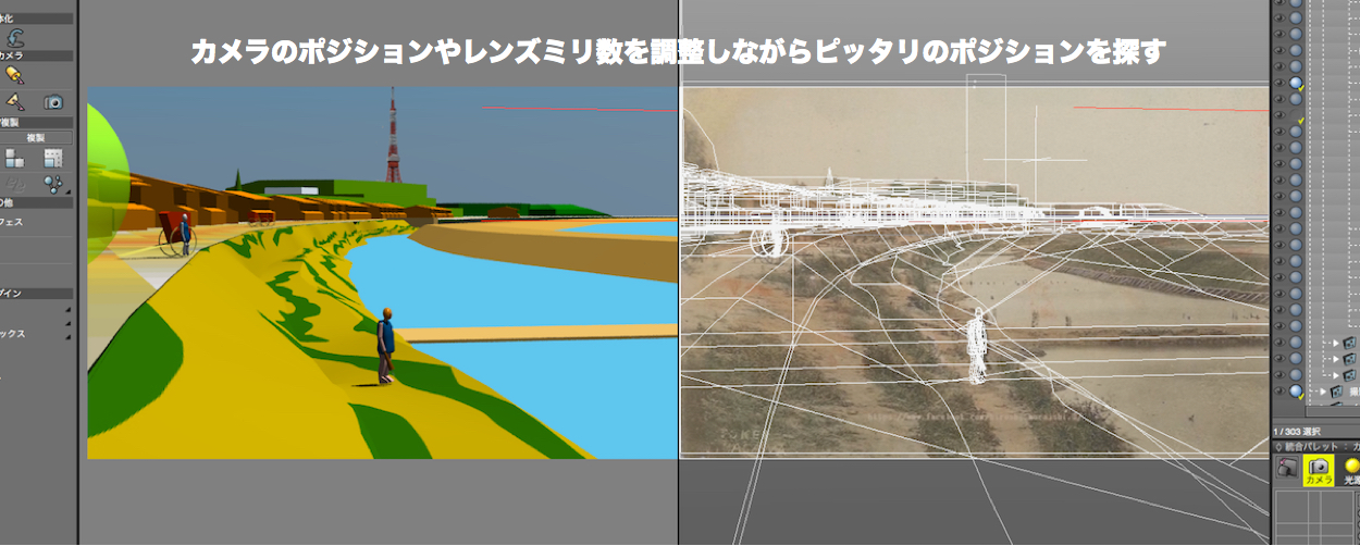 いよいよ、シミュレーションの開始。 まずは p1 p1 交番前のpointに、それぞれカメラを置き、東海道と築堤の関係を「高輪築堤写真」になるべく合わせながら、それぞれレンズとアングルを決めていく。