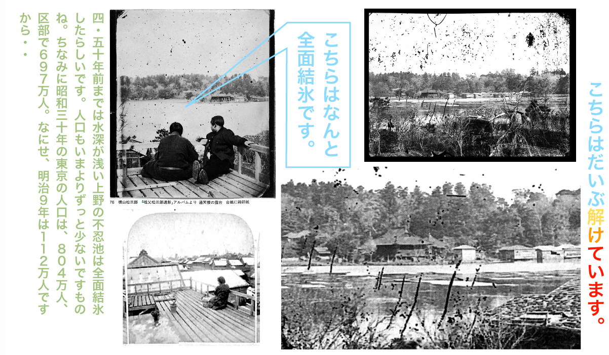 4・50年前までは、上野の不忍池は冬になると全面結氷していたんですね。そのころ庵主は東京にいたけど、それは知らなんだ。