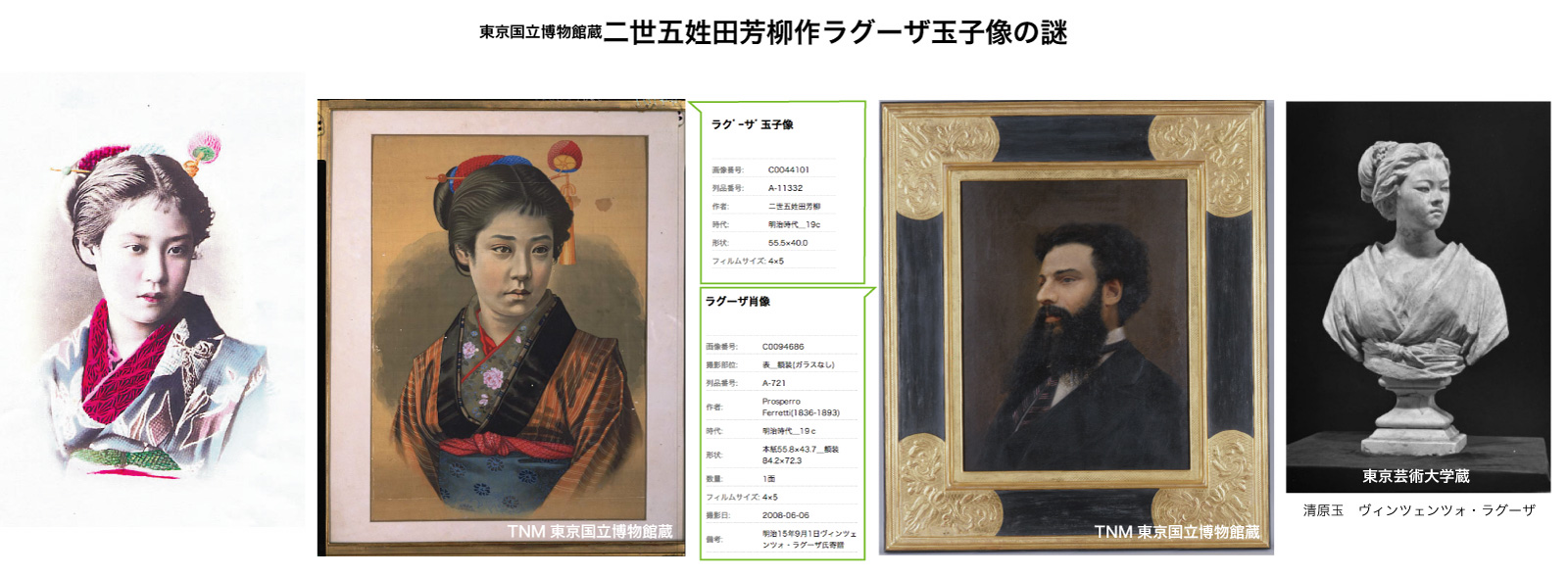 唐人お吉の写真などと言われてきた写真と、二世五姓田芳柳のラグーザ玉子の肖像画。