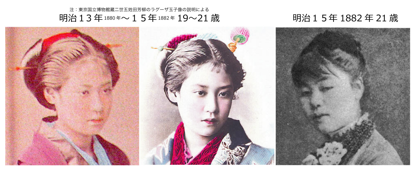 1879 18明治十二 初夏 玉子初めてラグーザの家(三田四国町=現芝2〜5丁目とも三田小山町=三田一丁目とも)に行く。それから間もなく、モデルをたのまれ応じる。