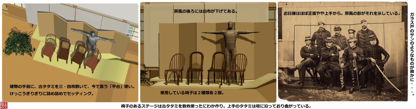 2種類4脚の椅子の置いてあるステージは、古ダタミを敷いたにわか作り、タタミ1枚半強のスペースに8人の男が収まっている。上手のタタミなどは、庭の起伏の傾斜にそって折り曲げてある。写真からそのタタミの繋ぎ目の隙間が写って見えるのである。