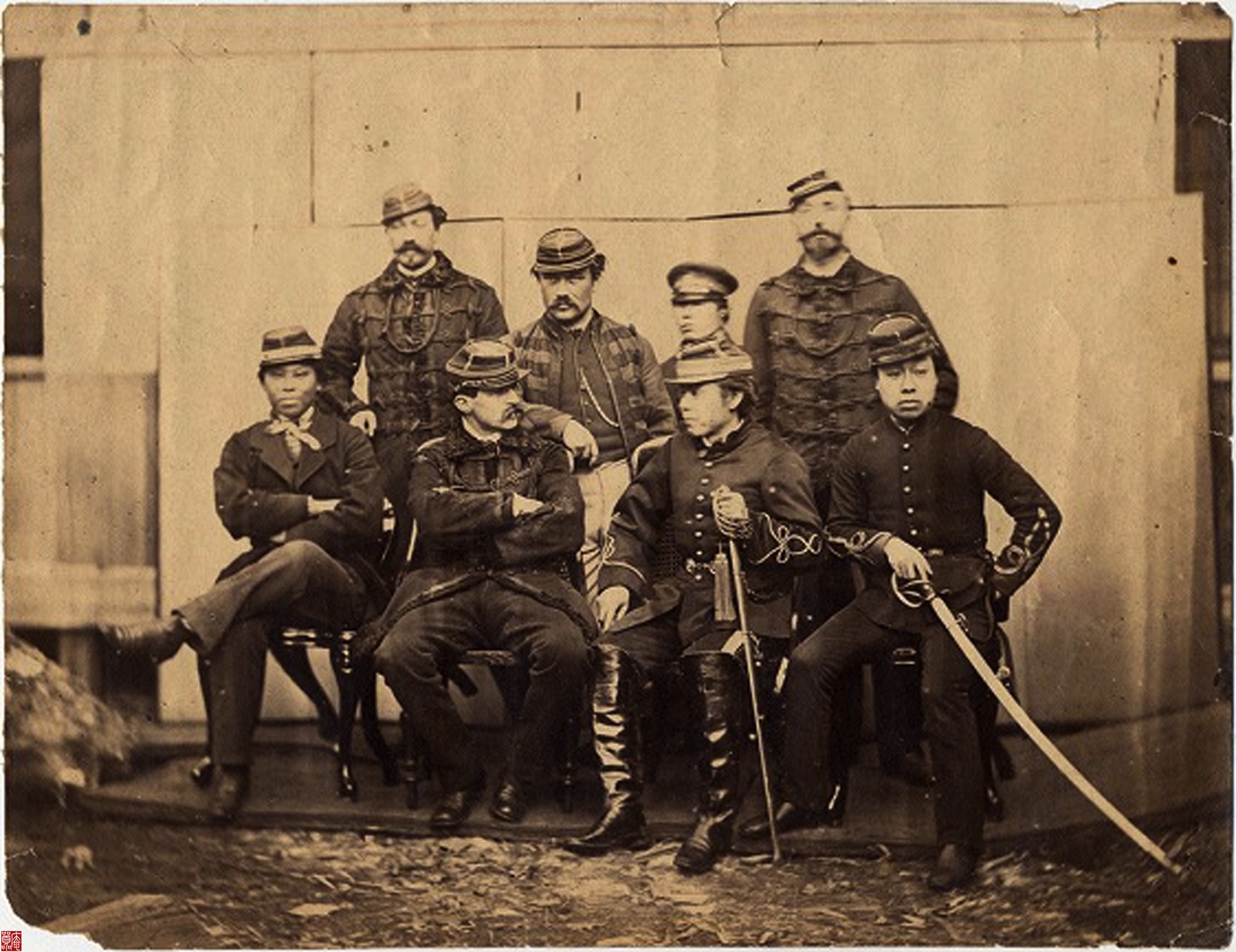 旧幕府の士官兵卒のために立ち上がった、ブリュネ、カズヌーブ、マルラン、フォルタン。同席した、細谷安太郎、松平太郎、田島金太郎応親、福島時之助。栄光のフランス陸軍軍服の装飾モールも、すでに輝きを失って、哀れにすら思える。(函館市中央図書館蔵)
