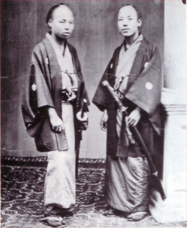 同じ敷物で上野彦馬説の「石橋兄弟写真」。円柱は次のリチャードソン写真と同じかと、見間違うほどよく似ている。