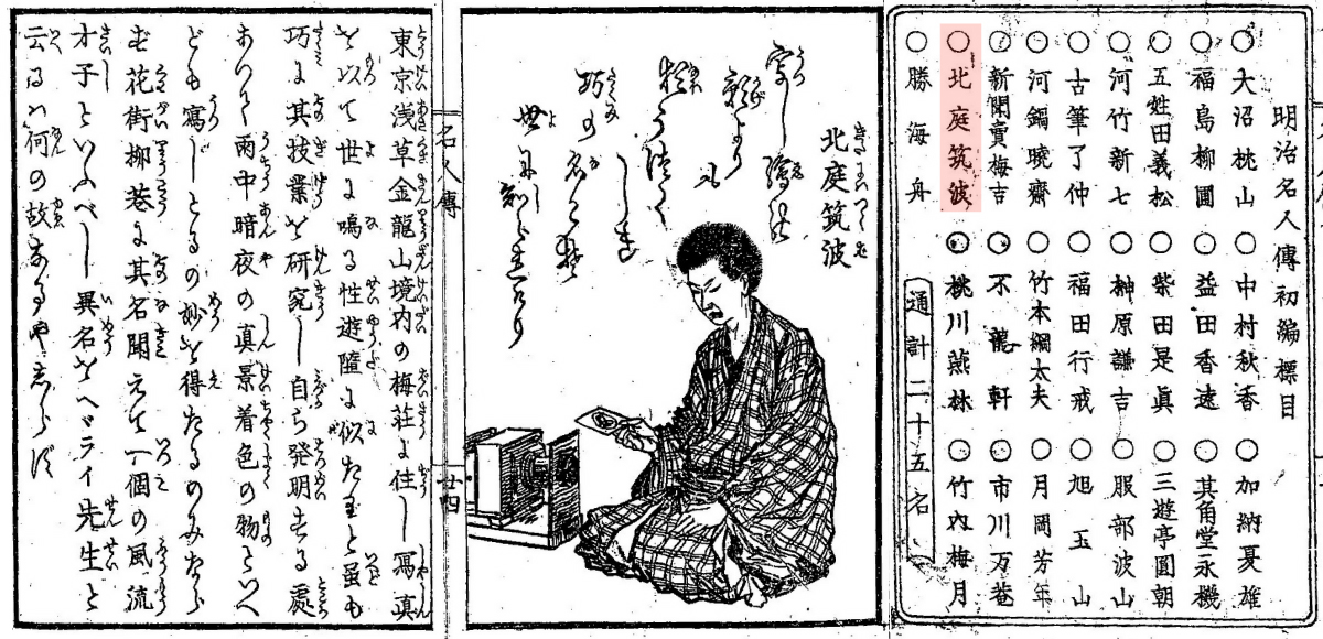写真家。本名:伊井孝之助。号、北庭筑波・平米雷(へべらい)。父、油屋伊勢吉。江戸日本橋呉服町出身。当時の画人や写真家の多くは山に関する号を使った。(庵主注:とくに筑波の面白いところは「駄洒落」付け「北には筑波」と洒落ました。)和漢洋の学に明るく江戸風の粋人であった。写真に興味を持ち、写真師内田九一・清水東谷・横山松太郎らと交わる。明治四年浅沼藤吉に写真材料店を開業させ、自らも明治四・五年ころ浅草公園で写真館を開業。明治6年闇夜でも写すことができる器械を取り寄せ、明治11年には、竜影を写した写真師として知られている。明治7年深沢要橘と協力し、日本初の写真月刊雑誌「脱影夜話」を創刊(脱影とは写真のこと)。約2年後には「フォトグラフィー」と改題。さらに後に「写真新誌」と改題された。明治9年に浅草に写真塾を開設。その後新橋に店を移す。明治14年10月浅草大代地の内田九一(明治8年2月17日歿)の写真館を購入して「旧内田舎」として再開業する。明治17年即席紙撮り写真を発明。交遊は広く写真界のみならず画家や文士らとの親交も多く、我が国の写真文化の基盤を築くのに大きな功績を残す。 門下生に二見朝隈(ふたみあさま、本名:二見勇)とその弟二見朝陽(ふたみちょうよう。本名:小林利藤太)、花輪吉野などがいる。イケメン新派俳優、伊井蓉峰の父。