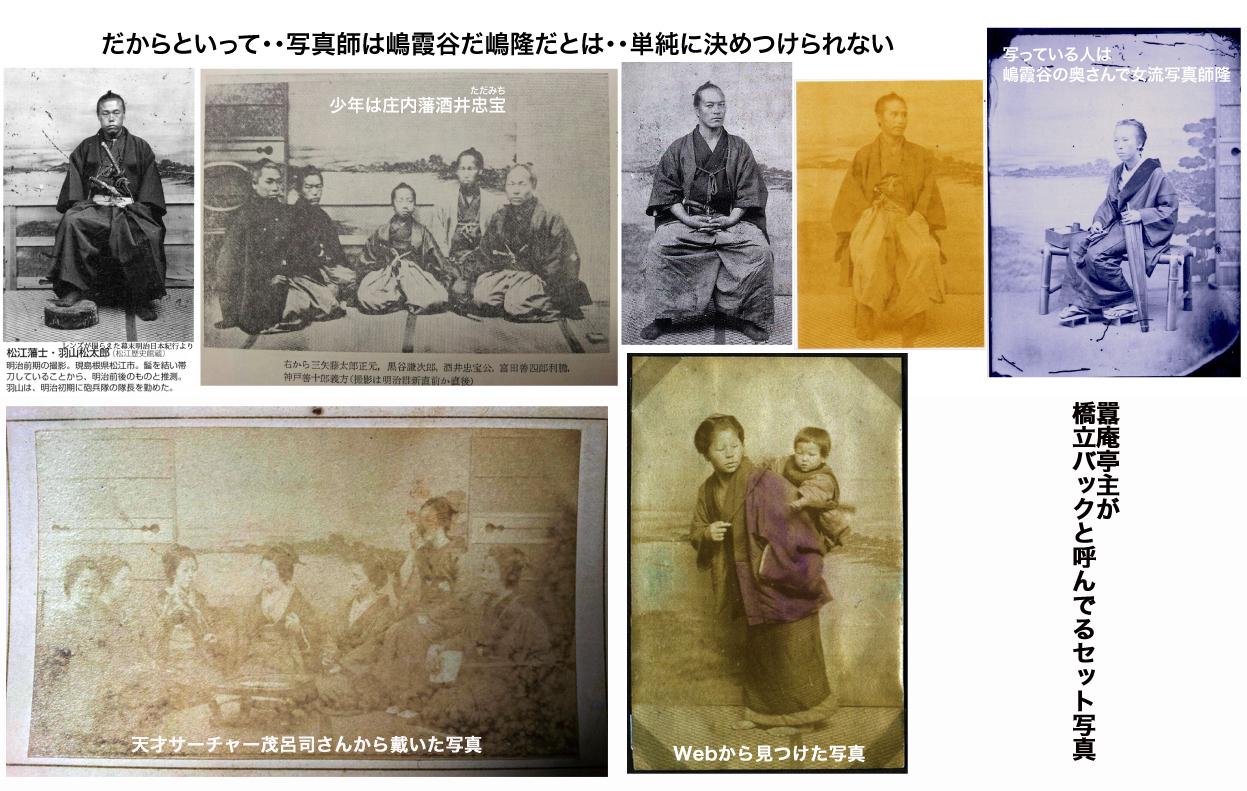 多種多様な人々の姿を留める写真の、共通した舞台セットは、特定の写真師の存在を示すわけだが、肝心要の記録が無いことには、カンや思いつきで、だれだれなどといって自慢げに話したところで、一歩も前進しないことなぞ、わかっておらぬん御仁が多いプロの古写真研究界に、余はうんざりだ。とぼやきつつも妄想はおもしろい。教養として余は、妄想は自分だけの内にしておく。