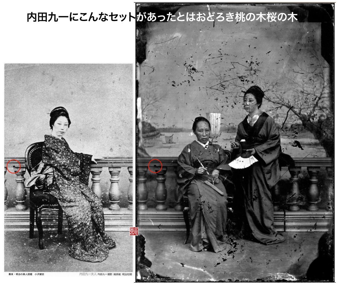函館市立中央図書館のデジタル資料館のDBでは「横山松三郎カ」となっていますが、大道具の欄干は内田九一の写真館のものです。横山松三郎と内田九一の付き合いは濃いと見て、九一の写場を借りて松三郎が撮したものかも知れません。