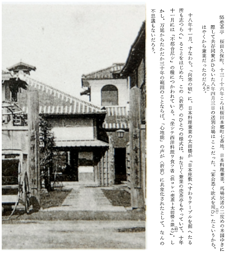 日本料理&西洋料理店「賣茶亭(楼)」は始め桜田久保町そして、桜田本郷町5番地もしくは7番地にとあるが、移転をしたモノか地番が変わったモノかはわからない。いずれにしても、現在の日比谷通りと西新橋交叉点の北東角のあたりとなる。