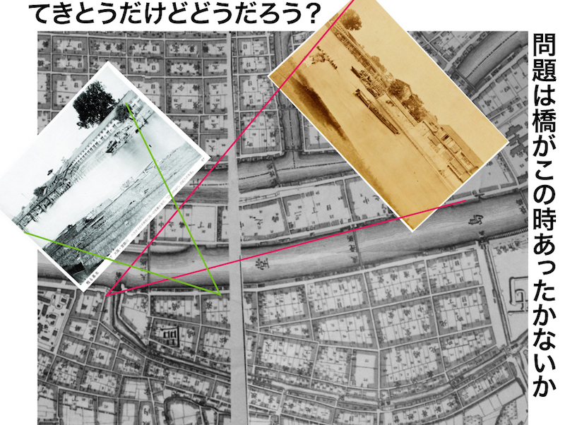 奥に見える橋の橋脚の数や、大型木造橋の平均橋脚間隔などを基に川幅を計算すると、80〜100m程の規模の川であることが想定できた。要するにこの川は、墨田川では絶対にあり得ないのだ。
