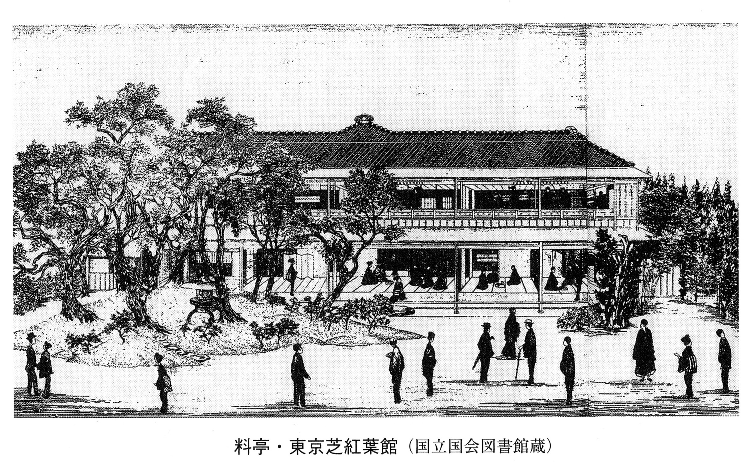 背景の建物フォルムや庭園の植栽の様子が、紅葉館の参考図とピッタリであることが確認できます。