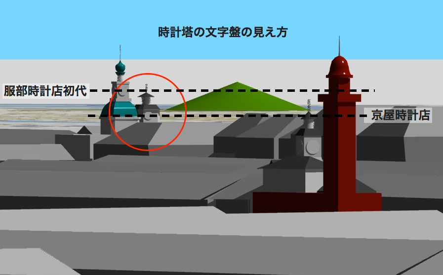 明治二十七年以後の設定では、同じ銀座四丁目にある、京屋時計店銀座支店と服部時計店の二つの時計塔は、やや重なって見える。