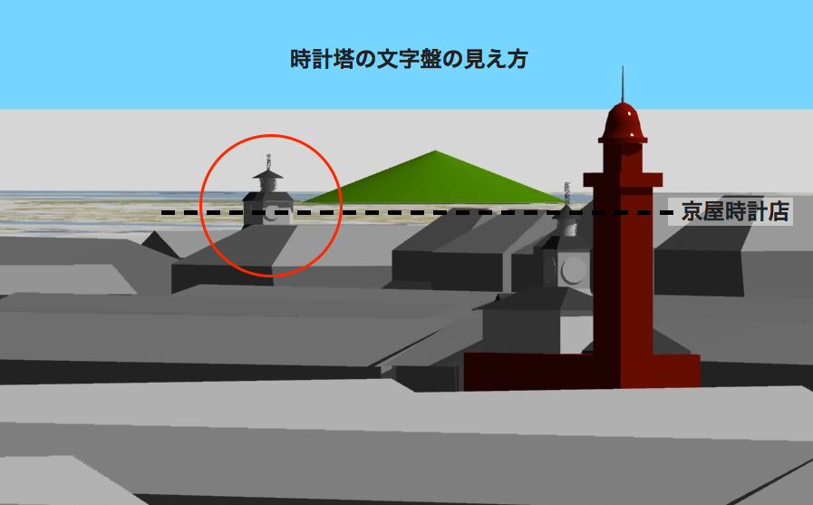 大時計の文字盤の中心の高さを、ほぼ同アングルのシミュレーション作図と、実際の古写真で比較した。
