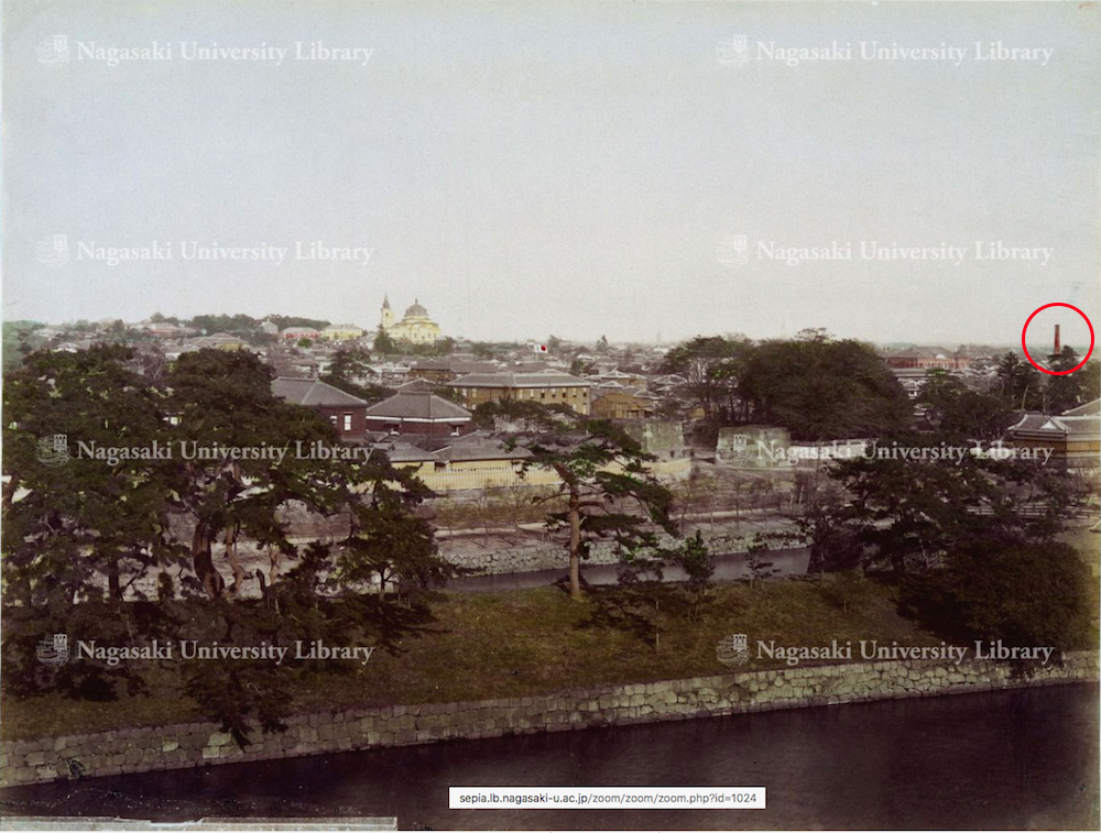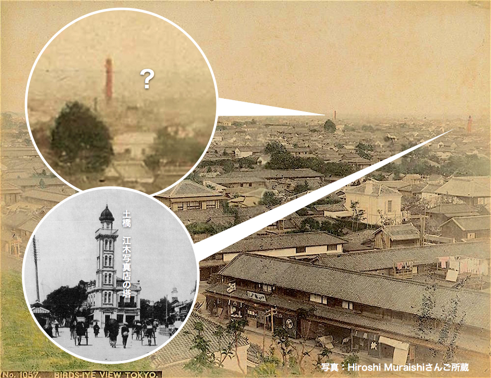 愛宕山山頂からの古写真で、上手に赤く着色された建造物は、京橋区丸尾町の江木写真店の名物タワーであることはすでに判明したが、中央の赤着色の煙突状のものは何なの?という疑問は残っていた。