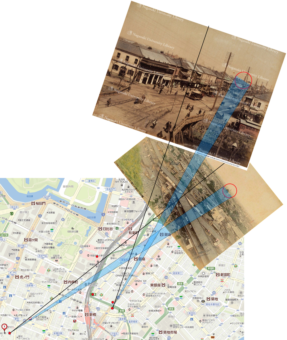 再び地図上で、新橋から銀座七丁目六丁目方向に線を引き、愛宕山から引いた線の交点を求めた。