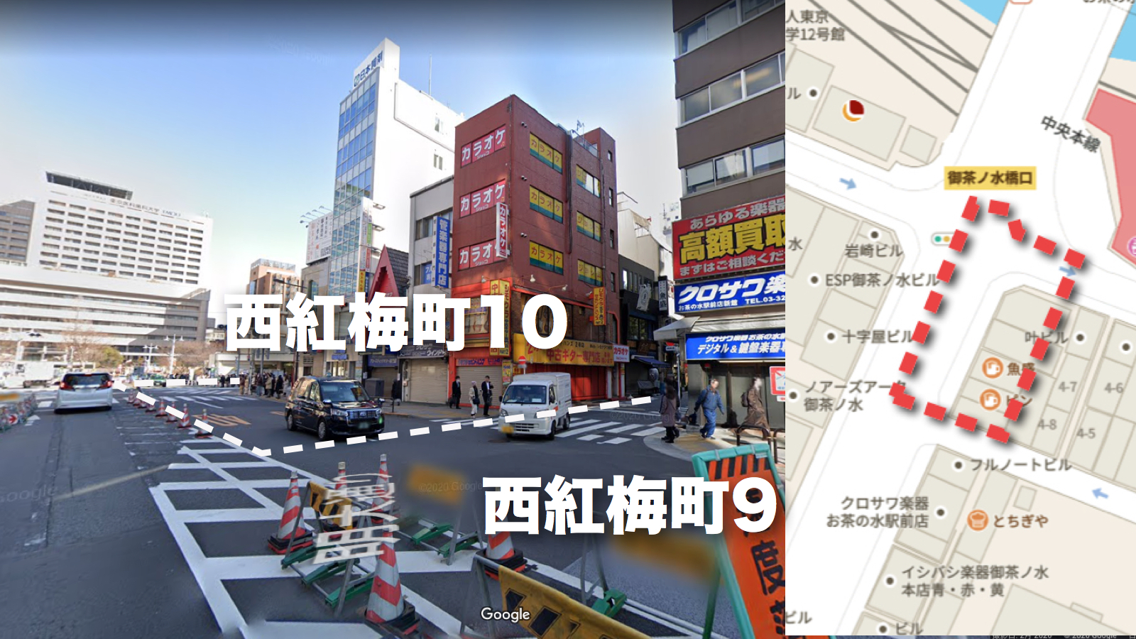 JR御茶ノ水駅前広場から駿河台下に向かう明大通りの左半分と隣接する歩道と5・6軒の小さなビルを含む三百坪ほどの長方形のエリアがそれだ。